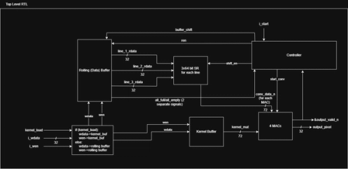 The Kernel Buffer was used to implement dynamic kernel loading. This wasn't too difficult, it is just a shift register that takes a 24-bit input (one row of a 3x3 kernel) per cycle.