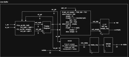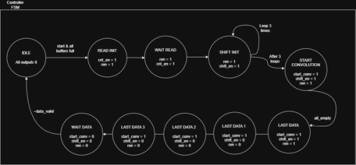 A Xilinx FPGA's BRAM has a built-in output register to avoid using a new on-chip flip flop. Unfortunately, this added a one-cycle delay for rdata to appear on the output, so a few cycles were added to the overall convolution process. If you look at the code, the ren && ~empty logic controls data from the BRAM to a "next data" register. However, regardless of ren and empty, the rdata is updated from the "next data" register. This is why the controller has a Wait Read and extra ren signal in Last Data.